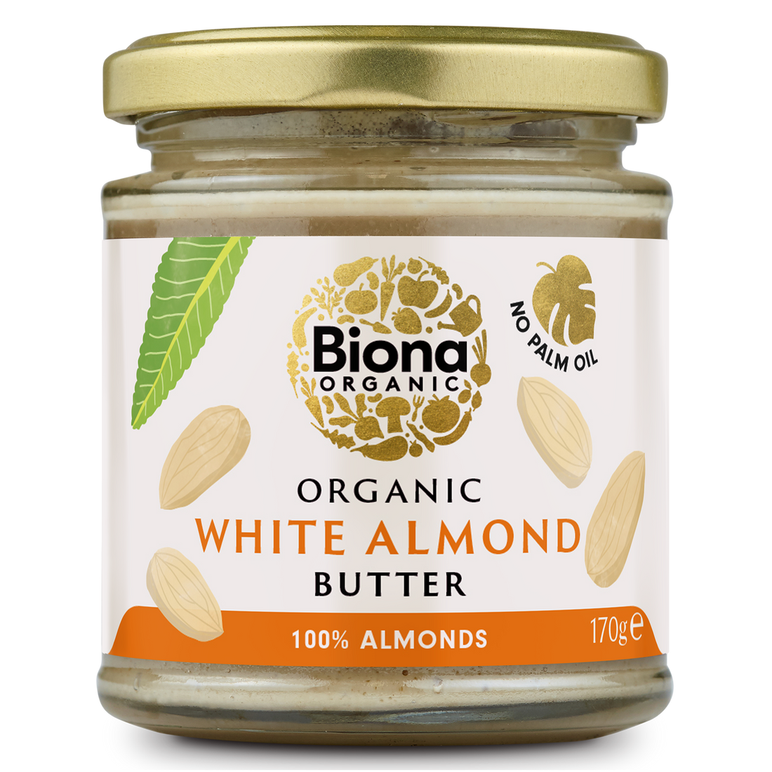 Biona Organic White Almond Butter is milled from small batches of certified organic sweet almonds. There’s no added sugar and we never use palm fat or emulsifiers, only the nut which means you receive all the protein rich goodness and taste.Using naturally sweet, blanched almonds, our White Almond Butter is a little lighter than regular Almond Butter but still as luxuriously creamy and packed full of energy building nutrients. Delicious used alone as a spread for toast, oat cakes or crackers, it also works beautifully blended into your morning smoothie, bowl of porridge or a variety of savoury dishes. With nothing but 100% pure sweet almonds inside, the nut oil may separate on occasion but this does not affect the quality of the product. Simply stir to restore to its natural consistency and enjoy! For best results, store in a cool, dry environment.