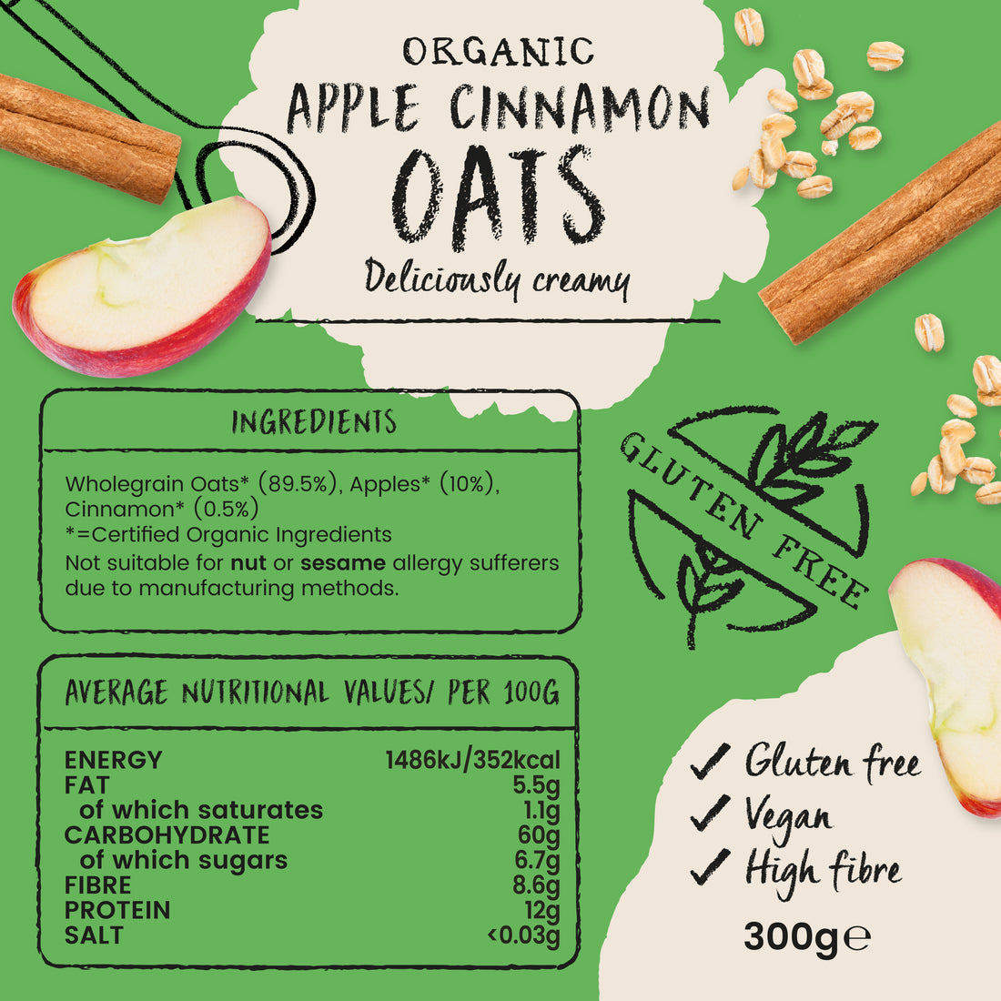 GLUTEN FREE PURE PORRIDGE OATS APPLE & CINNAMON 300g