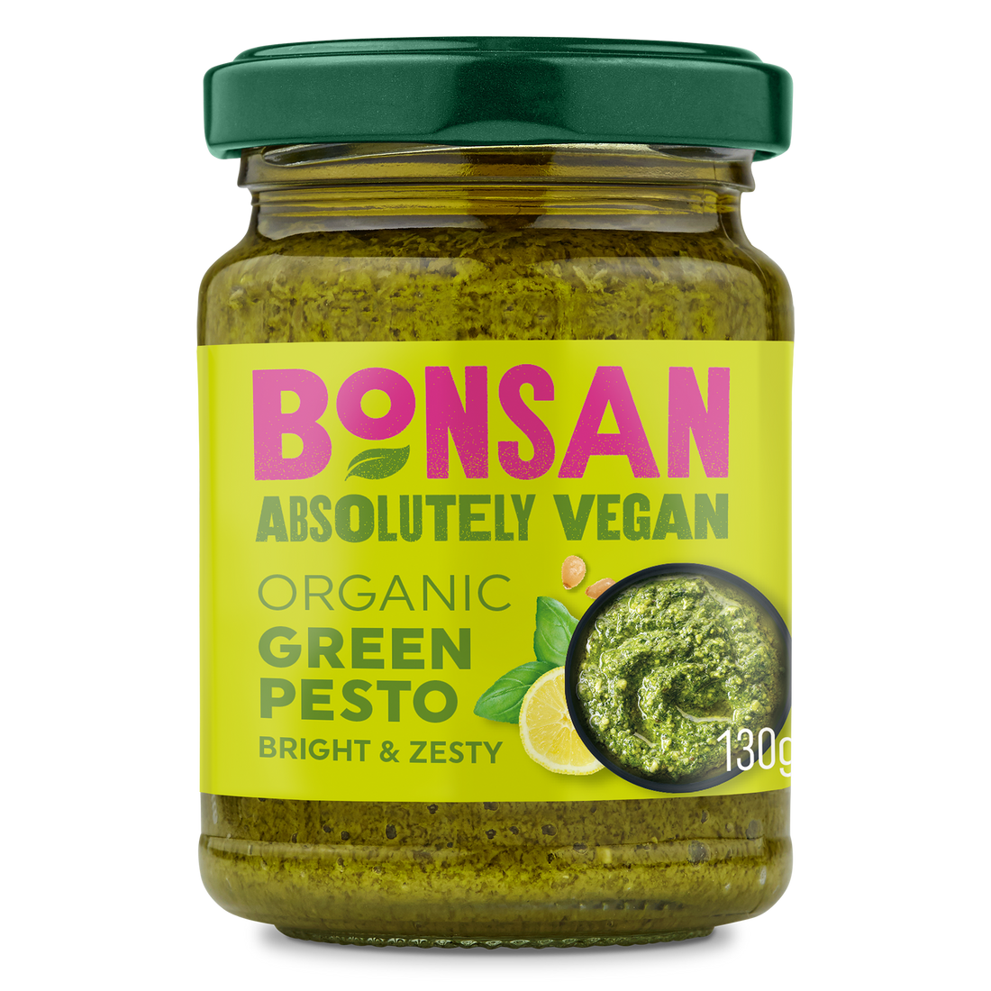 Vibrant green pesto that's made without dairy. Bonsan green pesto is packed full of basil, pine kernels and extra virgin olive oil for a bright and zesty flavour. Perfect stirred into pasta, drizzled over grilled vegetables or spread in sandwiches!