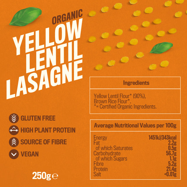 Drive your meals to the next level with our protein powered Yellow Lentil Lasagne Sheets. A wheat free pasta designed to provide you with plant-based protein that delivers on flavour AND function. Quick to cook, just layer up with vegetables and vegan lasagne sauces to become a pasta pro.